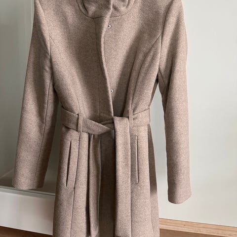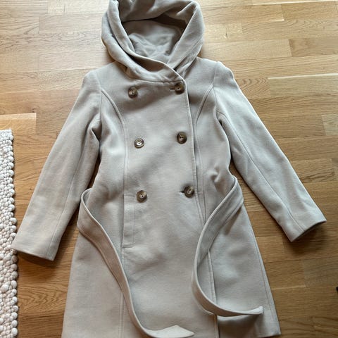 Selger denne grå kåpen i str 36. Den har knapper i front, og fasongen svinger lett inn i midjen. Stoffet er en blanding av ull/polyester. Den er synlig brukt, stoffet er jevnt over noe nuppete. Hempen til å henge opp kåpen (bak i nakken) er ødelagt.