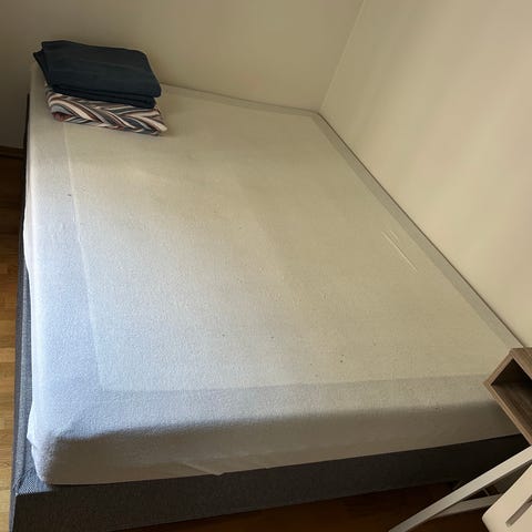 Bohus seng i grått tekstiltrekk. Sengen har overmadrass og står på ben som gir plass under sengen. Passer til soverom eller gjesterom der det er behov for en enkel og funksjonell sengeløsning.
