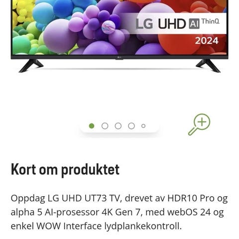 LG UHD AI UT73 65" 4K TV med 4K-oppløsning. Skjermen har UHD-bildekvalitet og støtter AI-funksjoner for bildebehandling. TV-en er egnet for vanlig TV-titting, strømming og tilkobling av eksterne enheter via tilgjengelige tilkoblingsmuligheter som vanligvis finnes på moderne 4K-TV-er. Passer til bruk i stue eller andre rom der man ønsker en større skjerm.