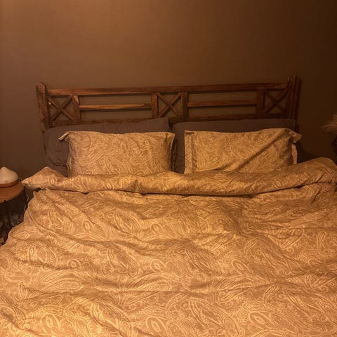 Sengegavl tilhørende en 180-seng. Kjøpt på Bohus for en del år siden. Like hel. Mørk grå med pyntebånd (offwhite/beige) rundt ytterkant. Ønskes solgt og hentet så fort som mulig. Høyde 118,5 cm. Dybde 9,5 cm.
