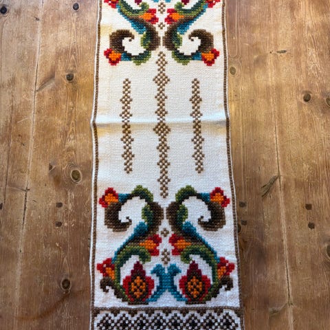 Vakker løper av stramei med blomster i korssting. Klare, fine farger. Hel og pen. Kan sendes med PostNord for kr 69,-.