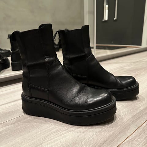 Vagabond støvler i størrelse 38. Modellen er en ankelhøy/halvhøy støvel i svart skinn med kraftig, profilert såle. Elastiske partier i sidene gjør dem enkle å ta av og på. Nøytralt design som passer til hverdagsbruk og kan kombineres med ulike antrekk.
