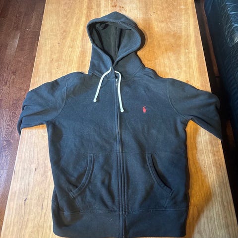 Ralph Lauren hettegenser for herre i størrelse M. Genseren er beige og laget i bomull. Modellen har glidelås i front, hette med snøring og to frontlommer. Ribbestrikket kant nederst og ved ermene for bedre passform. Nøytral farge som passer til hverdagsbruk og kan kombineres med ulike typer bukser og sko. Har noen bruksmerker, men de er minimale