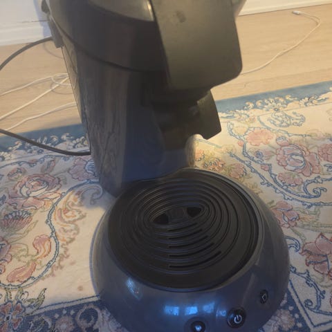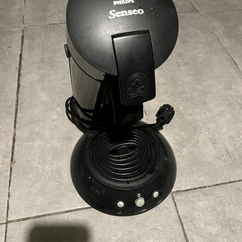 Philips Senseo kaffemaskin. Maskinen bruker kaffeputer og har avtakbar vanntank på baksiden. På toppen finnes betjeningsknapper for blant annet stor eller liten kopper kaffe. Dryppbrett kan tas av for rengjøring. Medfølgende innsats for kaffeputer følger med, som vist på bildene. Egnet for enkel tilberedning av kaffe hjemme eller på kontor, med kompakt design som tar liten plass på kjøkkenbenken.