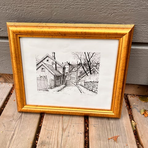 Bilde i gullfarget ramme med dyremotiv