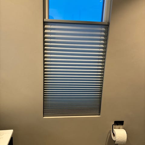 Gardinen har horisontale, plisserte folder som gir et jevnt og skjermende uttrykk i vinduet. Egnet til bruk i stue, soverom eller andre rom der man ønsker å dempe innsyn og lys.