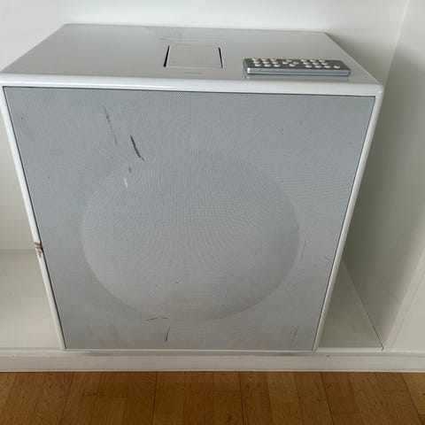 Selges musikkskap fra IKEA. Inkluderer selve hyllen, trådløs subwoofer og fjernkontroll.
