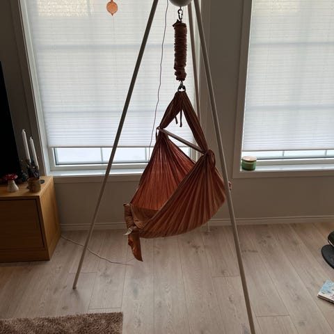 Stativet er fra Nonomo. Les mer her: https://www.onlinekids.no/nettbutikk/1467-nonomo/27711-nonomo-tipi-stativ-til-slyngevugge/