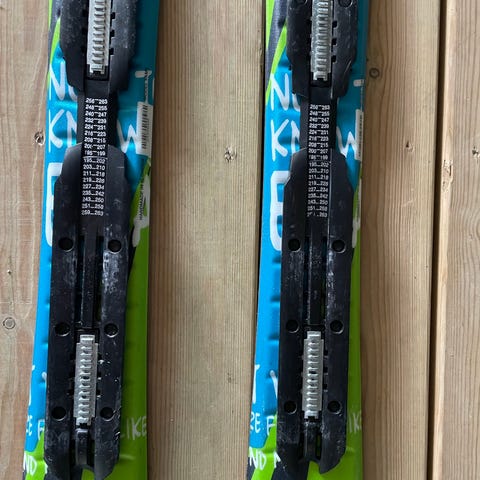 Elan alpinski med integrerte bindinger. Skiene har svart og blå toppsheet med tilhørende svarte/blå bindinger. Undersiden er svart med tradisjonell alpinski-konstruksjon. Egner seg til vanlig alpint bruk i preparerte bakker. Nøyaktig lengde, modellbetegnelse og mål er ikke oppgitt og bør eventuelt måles eller kontrolleres av kjøper.