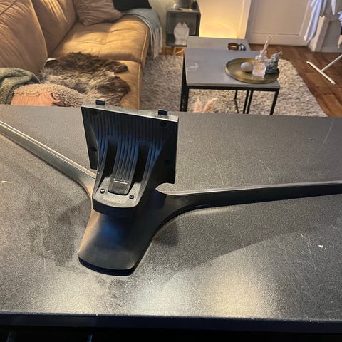 Samsung TV-fot Guide stand zmena C. Bordstativ i plast/metall til Samsung-TV, med buet Y-formet fot og rektangulær monteringsplate. Passer til utvalgte Samsung-modeller som bruker festet merket «Guide stand zmena C» (se etikett med kode SKBN9843582ABFFC / JBE124510 på bildene for å sjekke mot egen TV). Egnet som erstatningsfot dersom originalt stativ mangler eller er defekt.