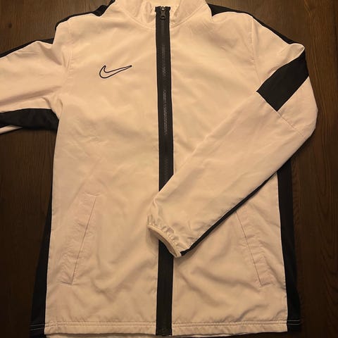 Nike The Athletic Dept treningsjakke for herre i størrelse M. Jakken er svart med lyse kontraststriper langs ermer og glidelås. Den har hel glidelås foran, høy krage og ribbestrikkede mansjetter og nederkant. Materialet er et syntetisk stoff som egner seg til trening og annen fysisk aktivitet. Passer til bruk både innendørs og utendørs som lett overtrekksjakke.