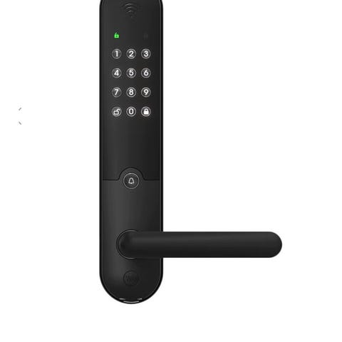 Sett for montering på ytterdør, med innvendig og utvendig låskasse, håndtak og frontplater. Låsen har talltastatur for kodelås og støtte for elektronisk åpning via kompatibel løsning (for eksempel app eller brikke, avhengig av tilbehør og oppsett).