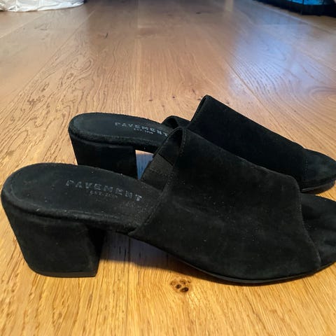 Svarte lekre skinn sko med hæler i størrelse 39. Skoene har åpen hæl med kraftig blokkhel og overdel i svart semsket skinn. Passer til bruk til hverdags eller mer formelle anledninger der man ønsker en enkel, svart hælsko. Sålen er i lys farge med synlig slitasje under, mens overdelen fremstår jevn og uten tydelige detaljer som spenner eller reimer.