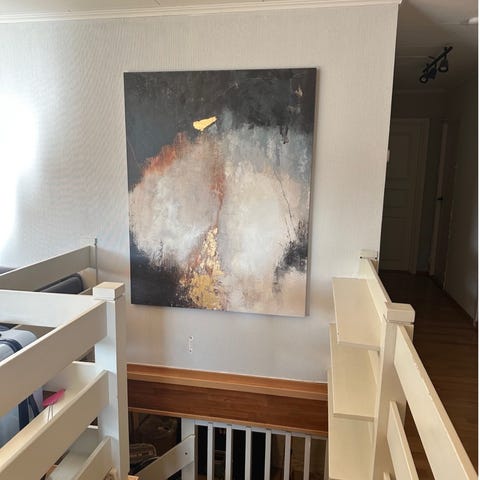 Selger et abstrakt maleri malt på lerret. Verket er preget av organiske former og en harmonisk fargepalett i sort, grått, hvitt og jordtoner, som gir et moderne og eksklusivt uttrykk til ethvert rom.