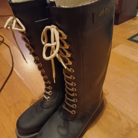 Ilse Jacobsen forede regnstøvler i størrelse 39. Høye snørestøvler i mørk brun gummi med lyse lisser.