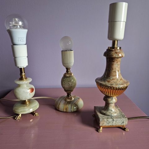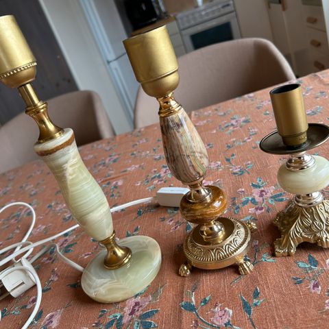 Ukjent merke blandet parti lamper består av flere ulike lamper til innendørs bruk. Bildene viser klassiske bordlamper med sokkel i metall og stein, noen med lampeskjermer i tekstil. I tillegg følger det med en vegglampe med dekorert glasskjerm og metallfeste, samt en slank gulvlampe i metall. Lampene har elektrisk tilkobling med ledning og er egnet som belysning i stue, soverom eller gang. Nøyaktig antall og mål fremgår av bildene.