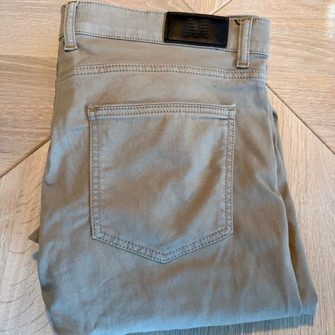 SAND Copenhagen bukser for herre i størrelse M (34-30). Buksen er brun og laget i bomull. Modellen har baklomme og beltehemper i linningen. Innsiden har rutet fôrdetalj og lapp som angir superstretch-kvalitet. Passer som hverdags- eller penbukse avhengig av styling.