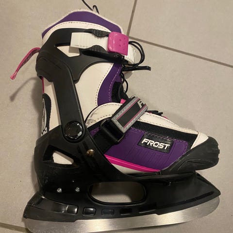 Frost justerbare skøyter for barn i lilla og svart. Skøytene har hard yttersko med spenner og stropp for god tilpasning rundt foten. Innvendig er det myk og polstret fôring for økt komfort. Modellen har justerbar størrelse som kan tilpasses etter barnets fot.