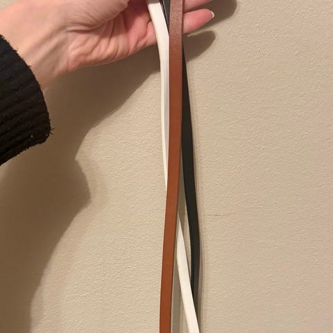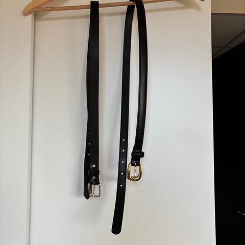 Lekre smale midjebelter i skinnlignende materiale med gullhempe, i fargene svart og mørkebrunt.