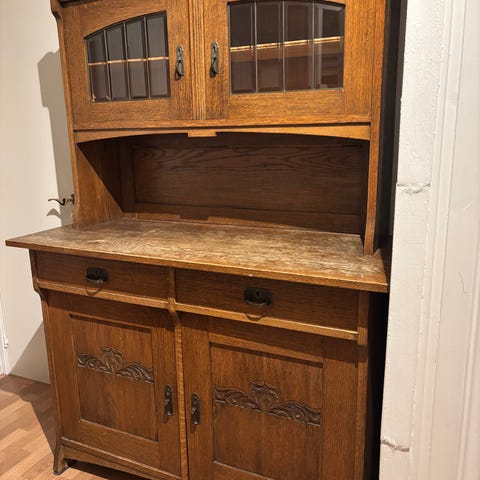 Dette skapet måtte gi tapt opp trapper til ny leilighet. Gis bort til noen med bredere trapp og god plass. Dette er et tungt skap, ca 100 kg som trenger stor bil og sterke rygger! Et fantasisk og unikt møbel bygget til et kunstneratelier i sin tid. Trenger litt puss og kjærlighet, men er et solid og spesielt skap bygget av en møbelsnekker på 1930-tallet. Må hentes, står nå i 1.etasje! HASTER!