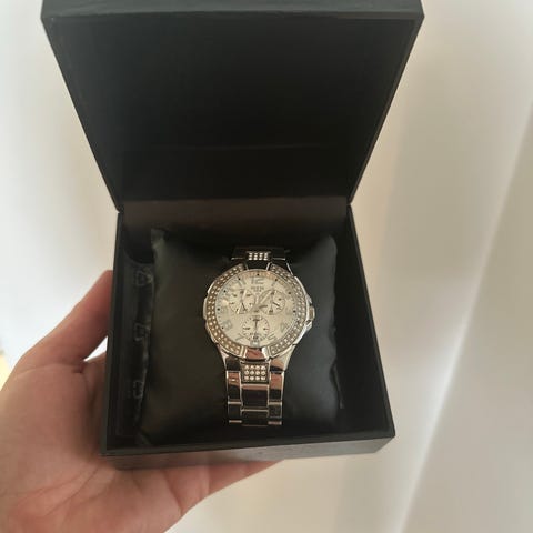 Guess dameklokke i stål med sølvfarget lenke. Klokken har rund urskive i lys tone med timeindekser og markerte visere. Bezelen er dekorert med steiner rundt hele urkassen. Leveres i original Guess-eske med urkjøpsbevis/garantipapirer slik det vises på bildene. Klokken er laget for dame og passer til både hverdagsbruk og mer formelle anledninger.