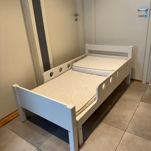 Brukt halvhøy seng, men masse bruk igjen. Mange klistremerke-merker, men det kan vaskes vekk. En planke i bunnen er borte, men det er ingen problem.