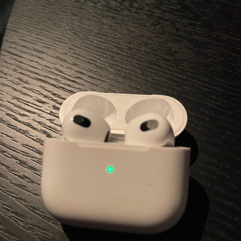 Apple headset i hvit farge. Trådløse ørepropper med ladeetui, egnet for bruk med kompatible Apple-enheter og andre enheter som støtter trådløs tilkobling for lyd. Pent brukt.