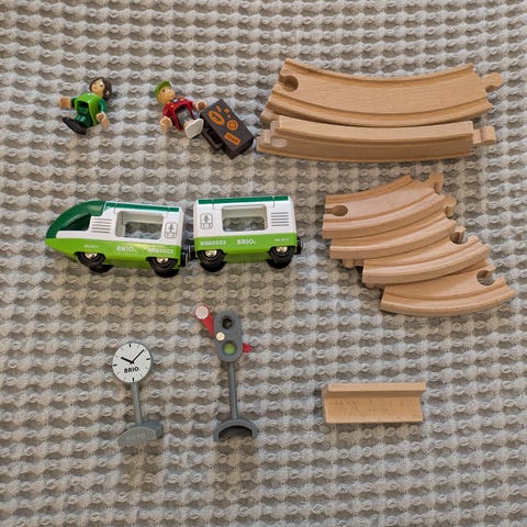 BRIO My First Railway Beginner Pack togbane for barn. Startsett med tog og skinner i tre og plast, tilpasset små barn fra 18 måneder og oppover. Settet inneholder fargerikt tog med vogner og enkle banedeler som er lette å håndtere for små hender. Togbanen kan brukes alene eller kombineres med andre BRIO produkter for å bygge ut banen etter behov.