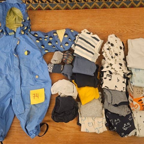 Klespakke til baby i størrelse 68 gis bort mot henting. Mest bomull, men noen få plagg i ull. Bodyer, bukser, strømpebukser og sokker, pysjamaser og sovepose.