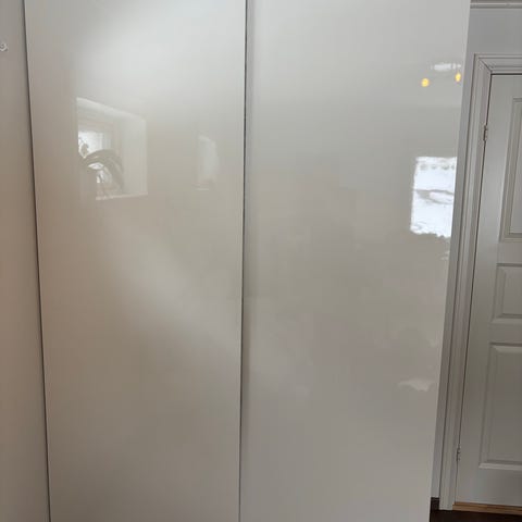IKEA pax skapdører i høyglans. Det sorte merket på ene døren er en skubb fra sovesofa. Går trolig av ved vask.