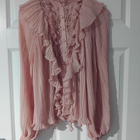 Hvit bluse med blonder fra ByTimo. Blusen har flotte blonder på bryst, og knyting og blonder nederst. Knapper bak i nakke.