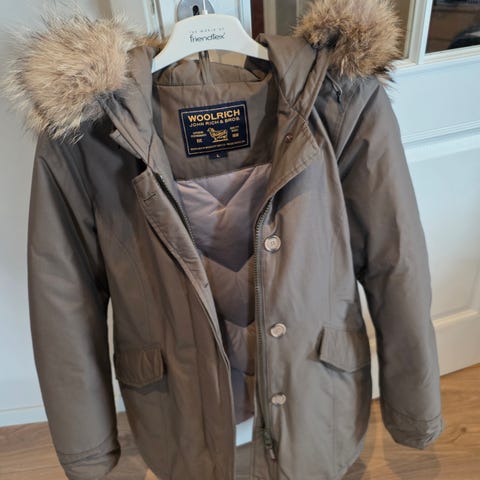 Woolrich dunjakke for dame i størrelse M. Jakken er svart og vattert med dunfyll. Den har hette med pelskant, gjennomgående glidelås med knappestolpe foran og lommer med klaff. Lengden går ned over hoftene for ekstra dekning. Brukt en sesong. Kvittering borte pga flytting.