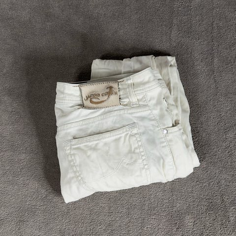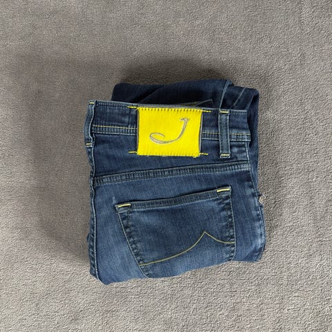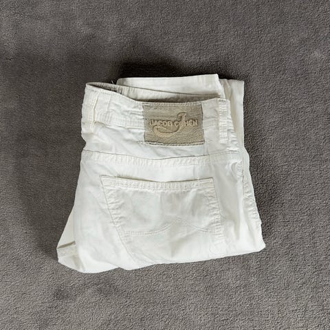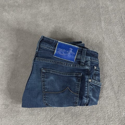 Selger en Jacob Cohën jeans i størrelse 31. Buksen er skreddersydd ca. 1 cm ned i lengden for et renere og mer moderne fall over skoene.