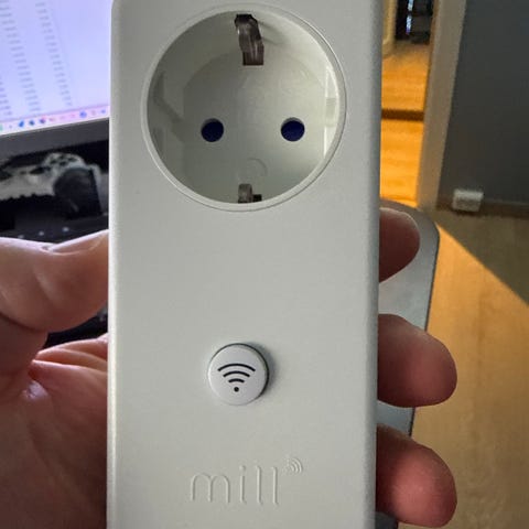 Mill WiFi Generation 3 smartplugg i hvit farge. Smartpluggen kobles til stikkontakt og gir mulighet for trådløs styring av tilkoblet enhet via WiFi. Enheten har jordet schuko-kontakt og støpsel, og er merket med tekniske spesifikasjoner og CE-godkjenning på baksiden. Passer til innendørs bruk der man ønsker fjernstyring og tidsstyring av elektriske apparater innenfor angitt effektgrense fra produsent.