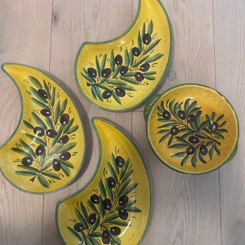 Mique Sweden skåler i keramikk med fruktmotiv. Eple, appelsin og lime. Sett med tre små skåler i fargene rød, grønn og oransje, alle med glanset glasur og formet som ulike frukter med bladdetaljer på kanten. Skålene egner seg til servering av snacks, tilbehør eller småretter, og kan også brukes som dekorative elementer på bord eller kjøkken. Formen og størrelsen gjør dem praktiske til porsjonsservering eller oppbevaring av småting.