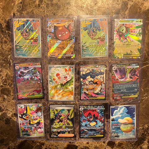 Lot med ulike Pokémon TCG-kort i forskjellige typer og utgaver.