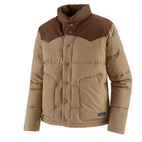 Patagonia dunjakke i mørkeblå farge. På bilde ser den litt lilla ut men den er navy-blå og kan bekrefte dette ved at den ikke selges i lilla i butikker og evt sende fler bilder i dagslys. Jakken har lett, vattert dunfyll med horisontale sømmer og høy krage. Glidelås i front og figurnær passform. Egnet som ytterjakke alene eller som isolerende mellomlag under en skalljakke.