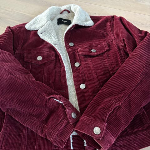Wrangler jakke for dame i størrelse S. Jakken er laget i rosa cordfløyel og har mykt, lyst fôr og krage med teddy-/pelsimitasjon. Modellen har glidelåslukking foran og brystlommer med klaff og trykknapp. #fæbrikstad