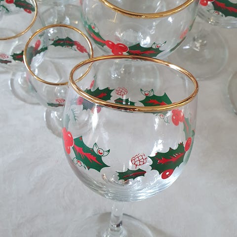 12 drammeglass med nissemotiv fra Magnor Glassverk, kun noen få er litt brukt, men alle fremstår som nye.