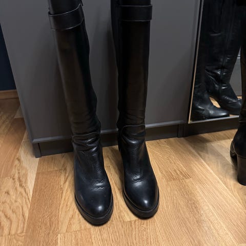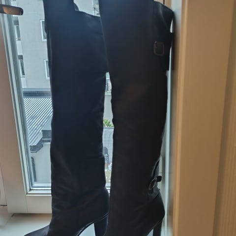 Bianco støvler i svart skinn i størrelse 40. Modellen er knelang med rund spiss og kraftig hæl. Støvlene har spenne øverst på skaftet og grov gummisåle. Egner seg til bruk i hverdagen og til enklere penere antrekk i kjøligere vær.