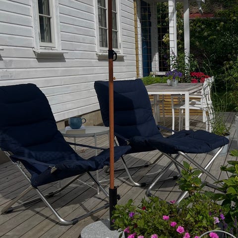 Sammenleggbar loungestol med polstret sete og rygg i beige tekstil. Stolen har lett metallramme med kryssben og rette armlener. Den høye ryggen og den myke puten gir støtte til rygg og nakke. Egner seg til bruk ute eller inne, for eksempel på terrasse, hage eller hytte, der det er behov for en lett stol som kan flyttes og lagres enkelt.