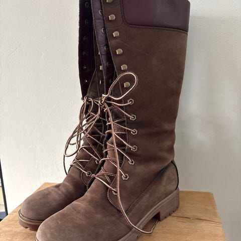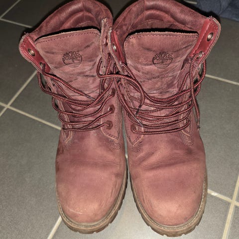 Timberland vinterstøvler i størrelse 40. Støvlene er høye med snøring og grov yttersåle. Farge i lilla/rosa nyanse. Overdel i skinn/suede-lignende materiale og fôret innside som gir ekstra varme. Egnet som vinterfottøy i kaldt vær og på glatt underlag.