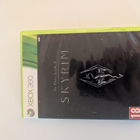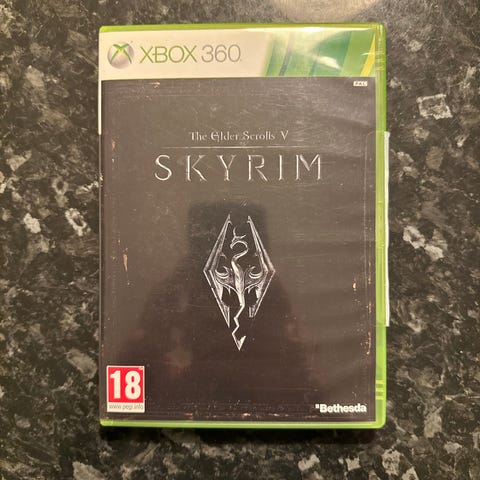 Fysisk utgave på plate i original grønn Xbox 360-eske. Forside og bakside med originalt cover. Inneholder spilldisk med trykk «The Elder Scrolls V: Skyrim». PEGI 18-aldersmerking.