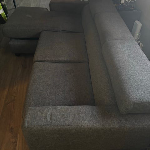 Godt/synlig brukt, fant på Marketplace selv ifjor; noe kattehår og kattekloring (se bilder), sitteputer har blitt dekket til med pledd.