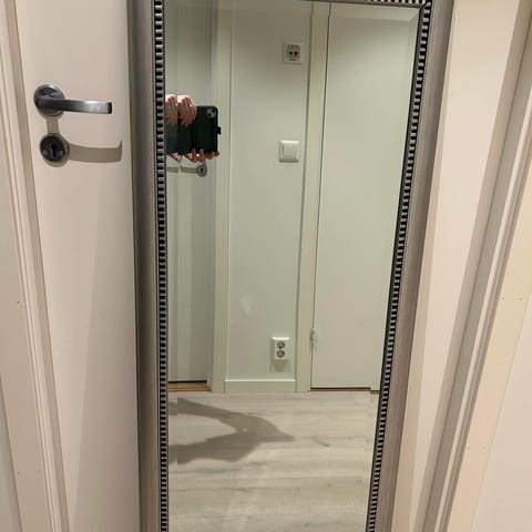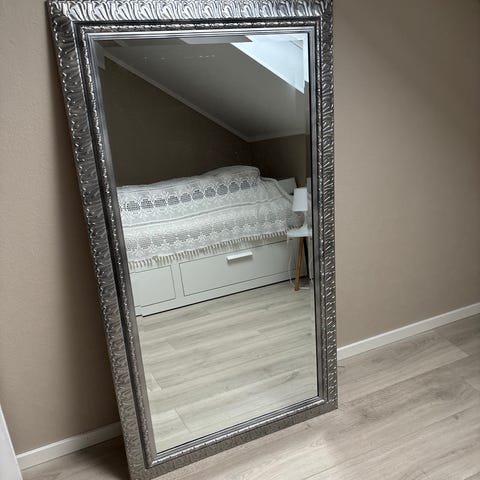 Sølvfarget speil med dekorativ ramme. Har tidligere vært sort som stedvis skinner gjennom, for et tøffere look.