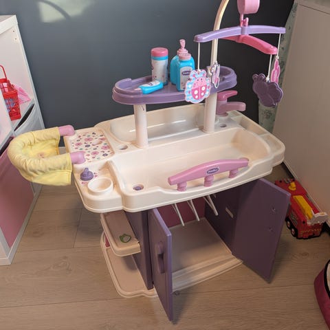 3-i-1 stellestasjon i lilla og rosa, med både stellebord, spisestol/område og badekar - i tillegg til et praktisk klesskap under til alt av dukkeklær, hylle på toppen og flere hyller rundt.