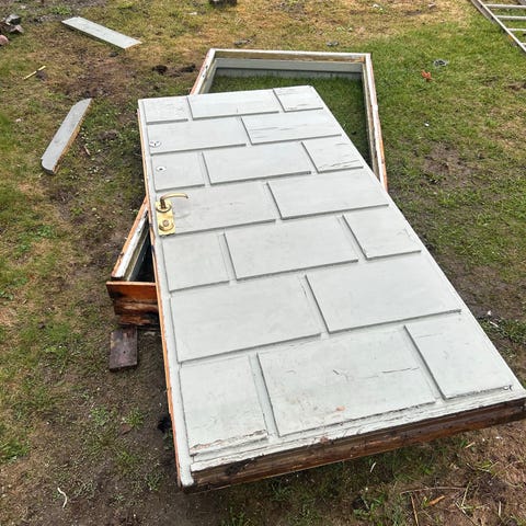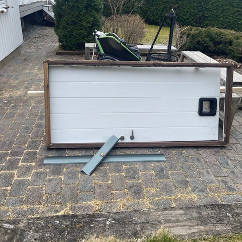 God gammeldags ytterdør fra 1968. Innsiden er malt hvit, mens utsiden er brun. Følger med sidefelt, men kan kjøpes separat. Du får både lys og skjerming samtidig med dette glasset.