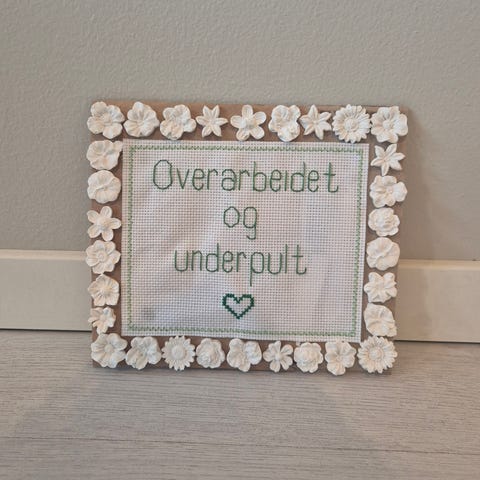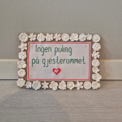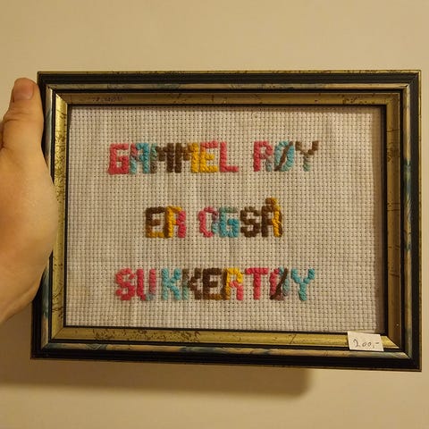 Gerilja broderi str. 10x15 cm i ramme.Gammel røy er også sukkertøy.Kan sendes.