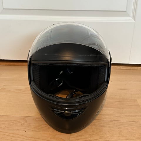 MC-helhjelm i str. M (58 cm) i svart farge. Hjelmen har klart visir som kan vippes opp og ned, samt ventilasjonsåpninger på toppen. God polstring på innsiden for bedre passform og komfort.