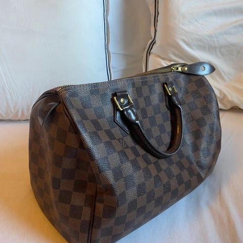 Louis Vuitton Speedy veske for dame i lær. Vesken har karakteristisk rutemønster (Damier) i mørke og lyse brune toner, med doble hanker i mørkt lær. Den lukkes med glidelås på toppen og har metallbeslag i gullfarget metall. På bildene vises også en avtakbar skulderrem med Louis Vuitton-logo. Egner seg som hverdagsveske eller til lettere reiser, med plass til nødvendigheter som lommebok, mobil og små personlige eiendeler.